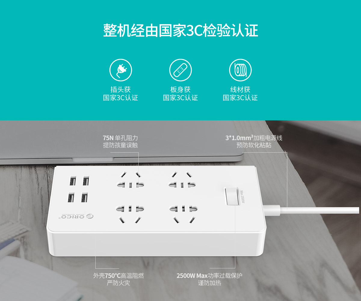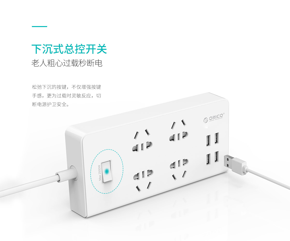 新國標便攜桌面式排插,獨立開關,2500W大功率