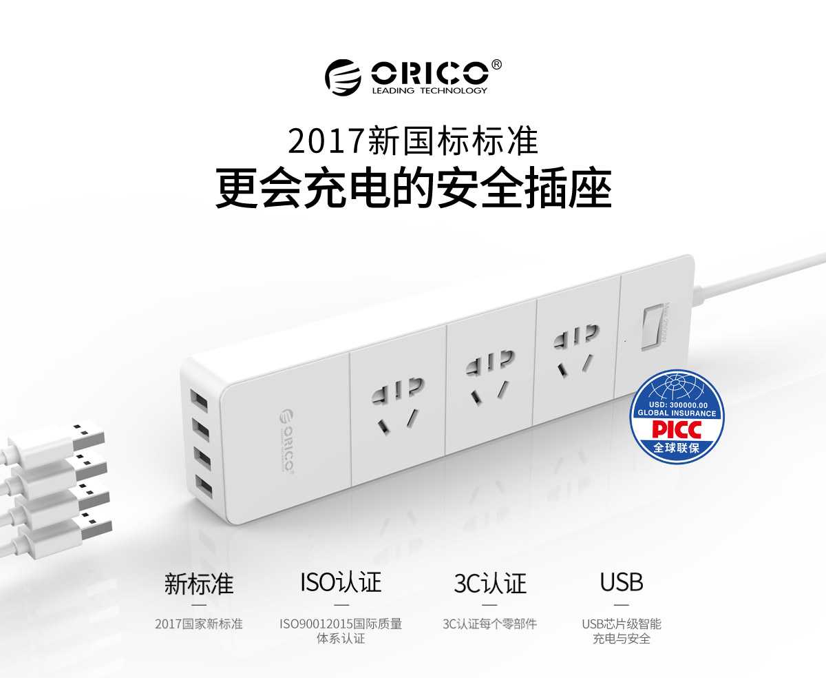 便攜桌面式排插 4口USB+3A接口 750℃耐高溫 單口支持2.4A