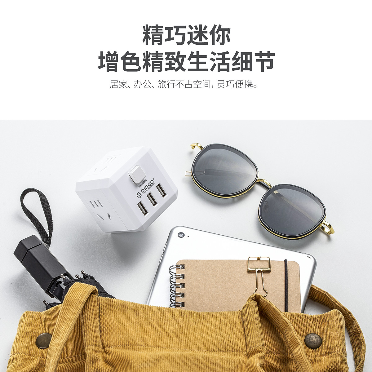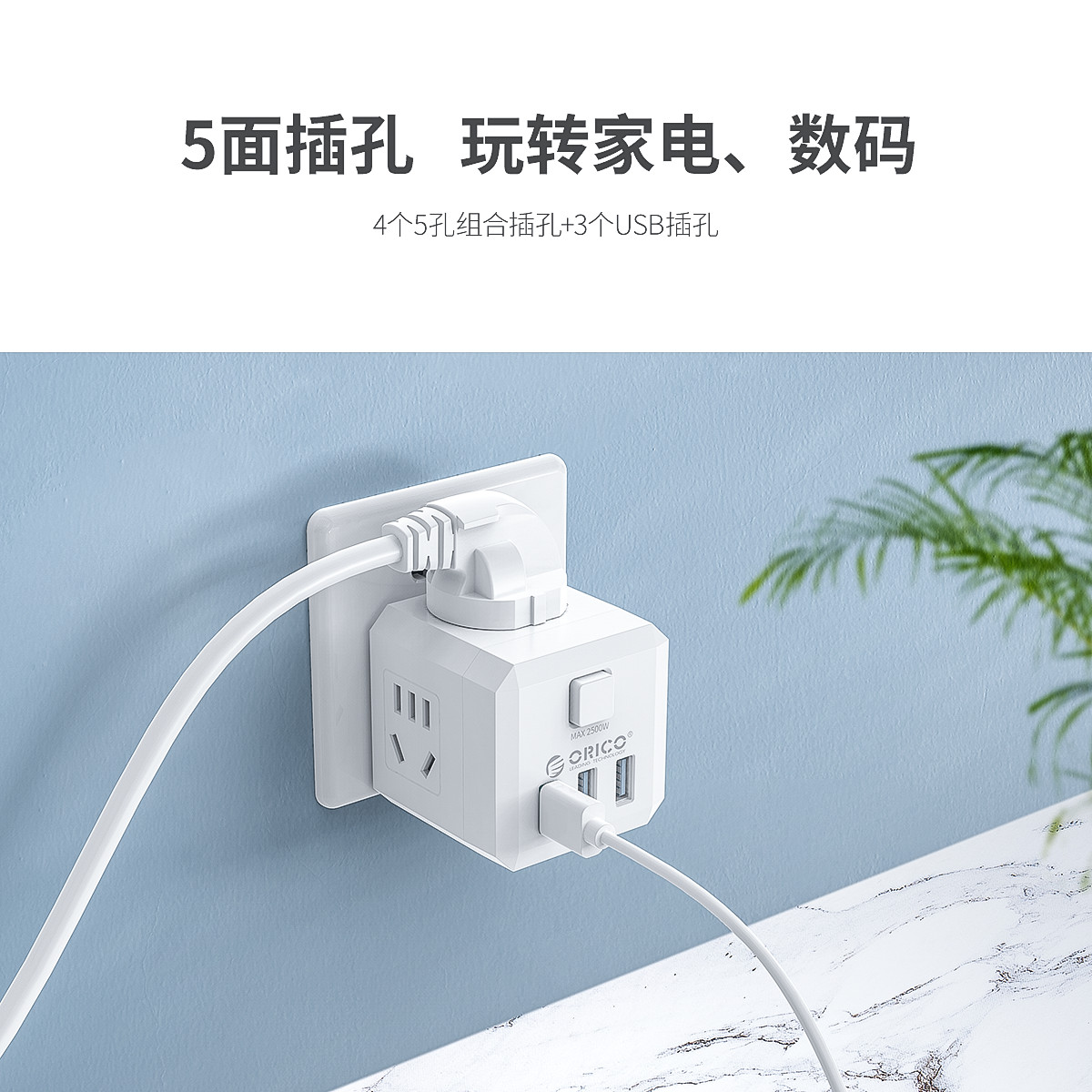 電立方2500W大功率4 AC口+3 USB排插(帶總控開關)