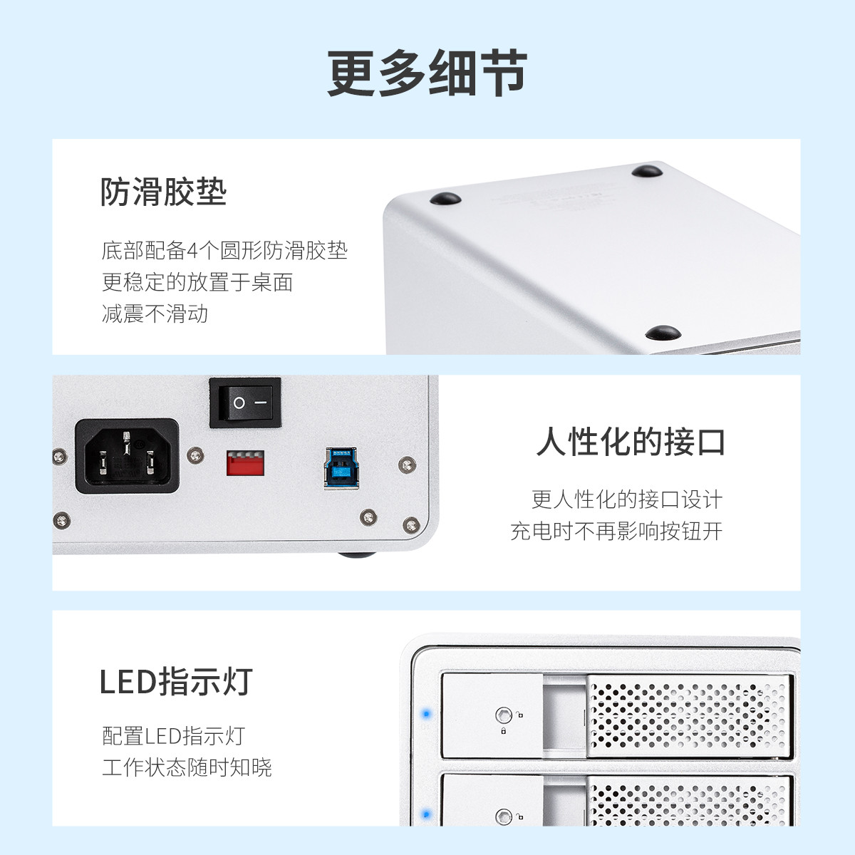 USB 3.0轉SATA Revision 3.0,5Gbps高速傳輸,雙核芯片,安全穩定,多RAID模式支持,雙重散熱,大容量支持,自帶鎖孔,安全升級,內置電源適配器,穩定運行