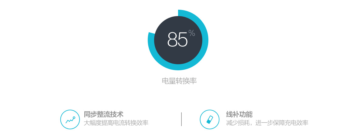 采用同步整流技術,大幅提高電流轉換效率,充電效率達85%,另外還有線補功能,減少損耗,進一步保障充電效率,打會盹的時間手機就充滿了。