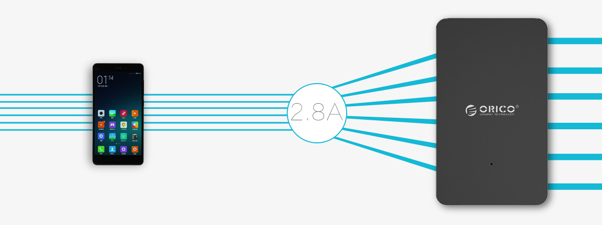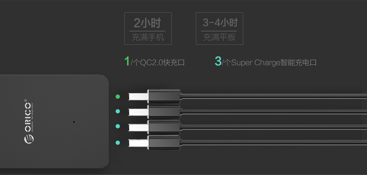 四口智能充電接口設計,其中1個為Qc2.0快充口,3個Super Charge智能充電口,單口可達5V2.4A,34 W大功率輸出,經過測試,2小時即可充滿手機,3-4小時充滿平板。充電更快更平穩,一次性解決您的充電煩惱。