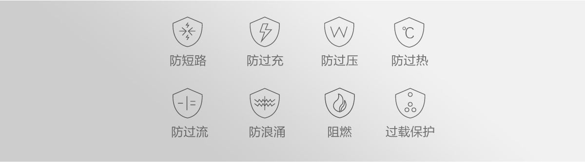 八重安全保護,采用耐高溫工程材質,配置固態電容,提供防過流、防浪涌、防過壓、防短路、防過充、防過熱、過載保護、耐高溫8重保護模塊,以保證您的充電設備安全。