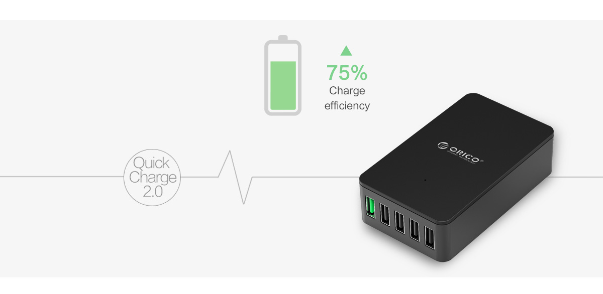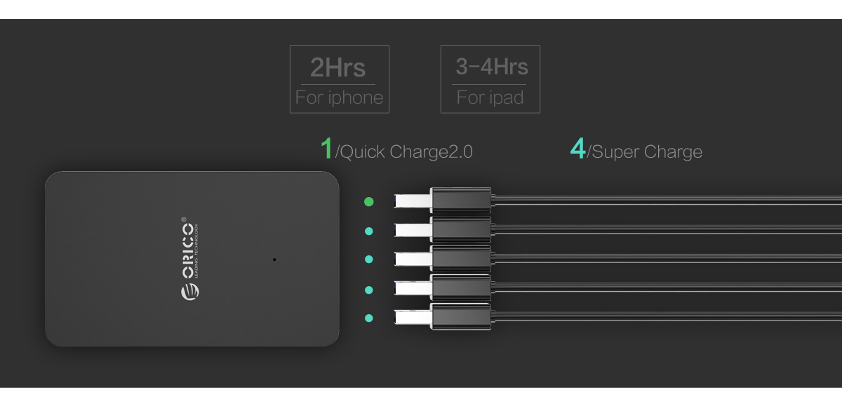 五口智能充電接口設(shè)計(jì),其中1個(gè)為Quick Charge2.0快充口,4個(gè)Super Charge智能充電口。單口最大5V2.4A, 40W大功率輸出,經(jīng)過(guò)測(cè)試,2小時(shí)即可充滿手機(jī),3-4小時(shí)充滿平板。充電更快更平穩(wěn),解決您的充電煩惱。
