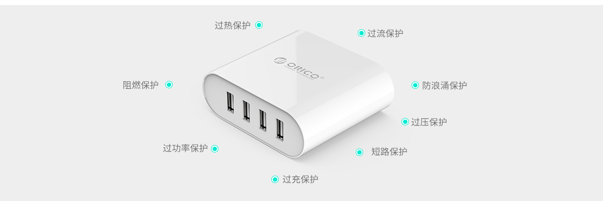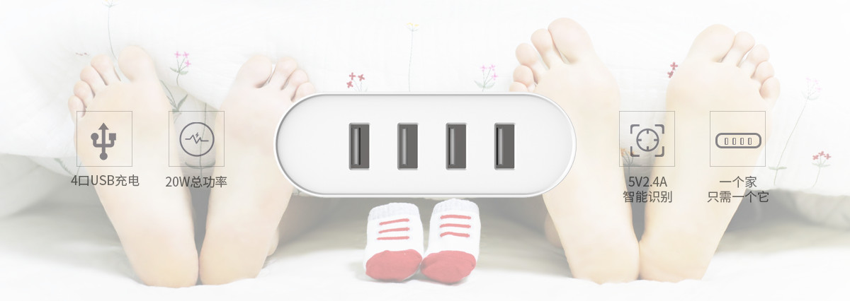 4口USB快速充電,滿足數碼時代的多種設備充電需求,20W強勁供電能力,升級搭載2.4A充電接口四個,充電有我一個就夠了,整合家里各種各樣的充電器,不讓充電設備凌亂了原本整潔的家。