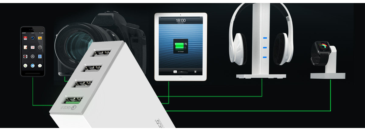 為了實現更智能的充電操作,ORICO QSL采用電流控制和管理模式,配備USB智能充電芯片,可自動識別充電設備,智能匹配合適充電方案。無論您是平板、手機還是移動電源、Ipod、MP4等各種5V設備,Supercharge口都可以自動偵測,給予設備更快的充電電流。